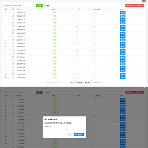 管理系统中的号码信息,包括查看、搜索和删除号码数据。